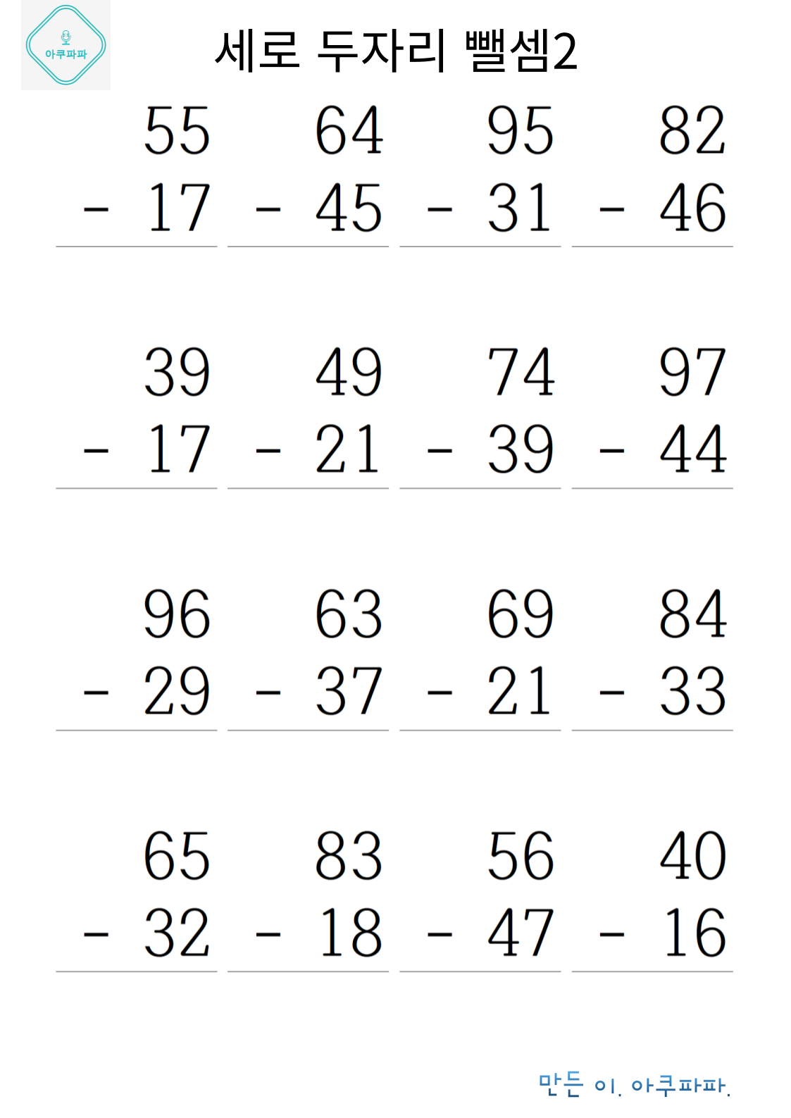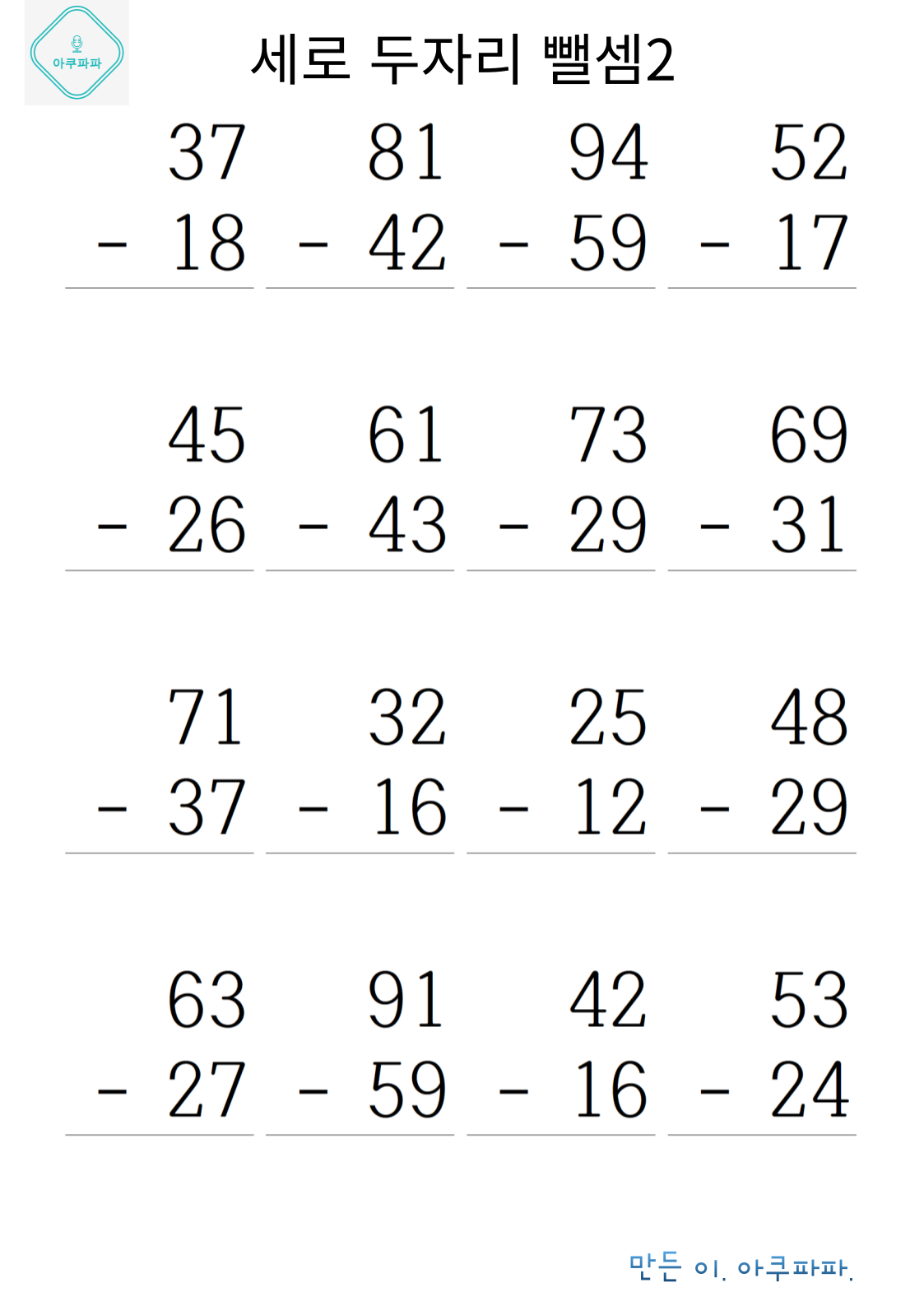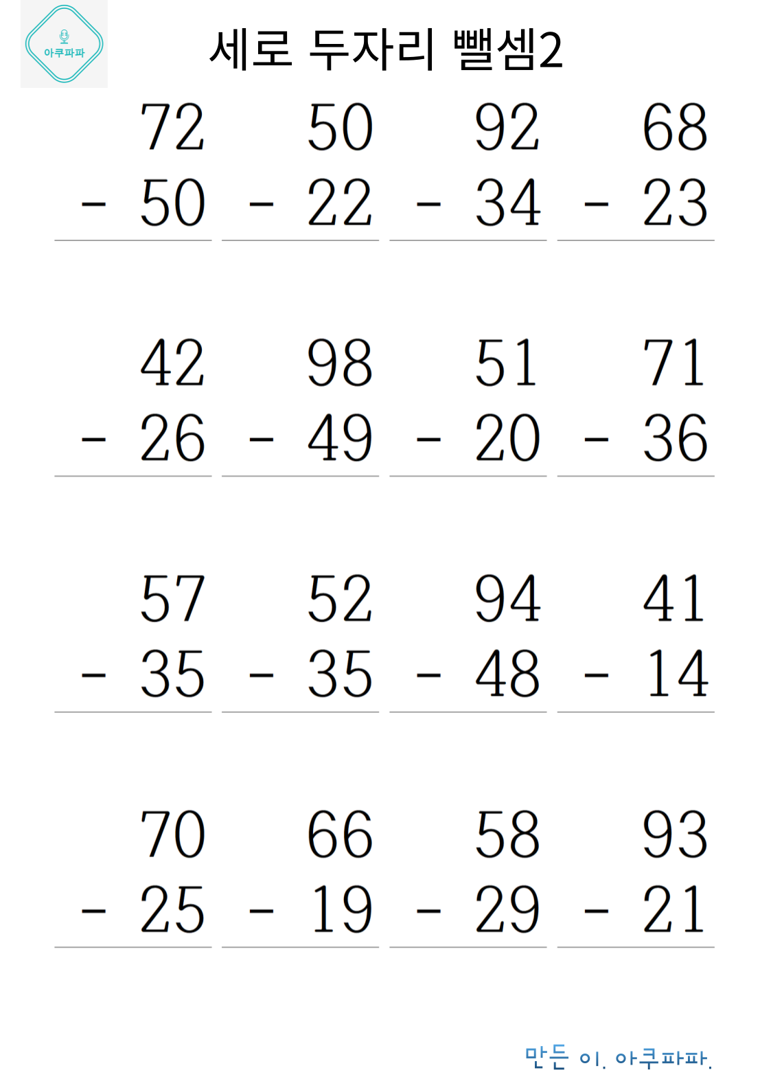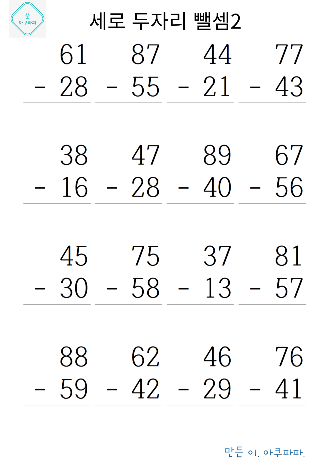 | 두 자릿수 뺄셈 1 (0) | 2024.07.22 |