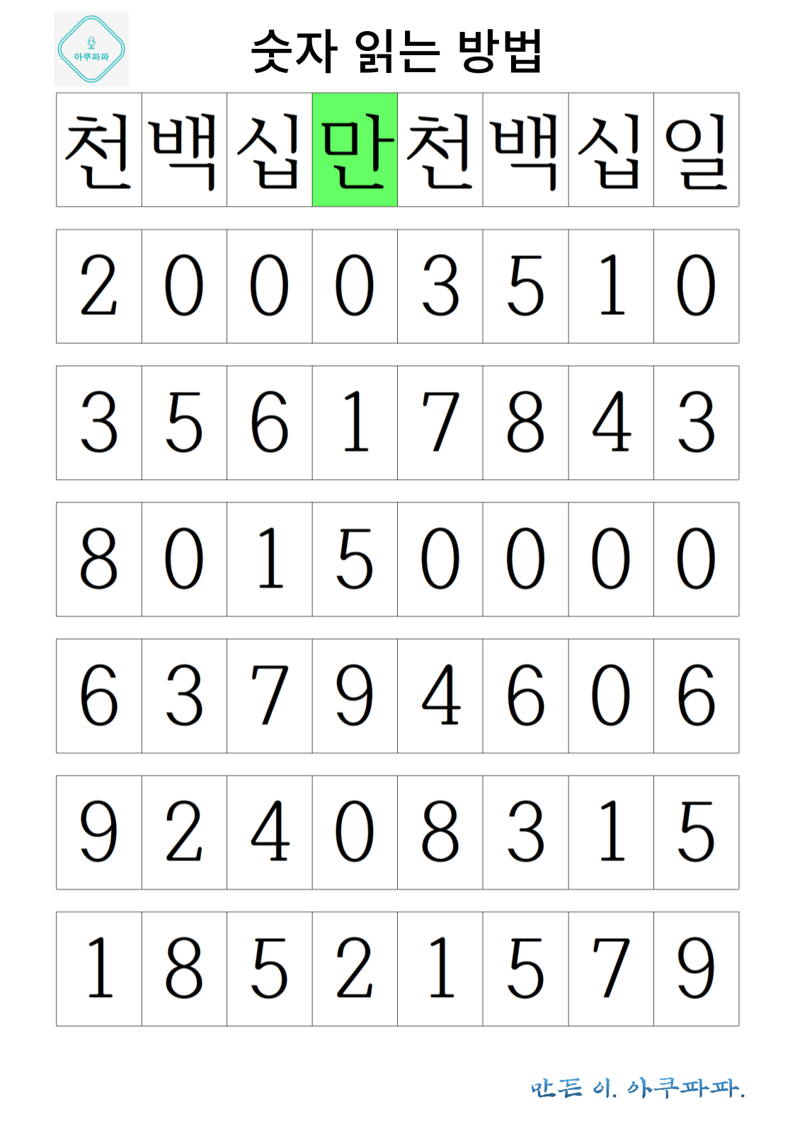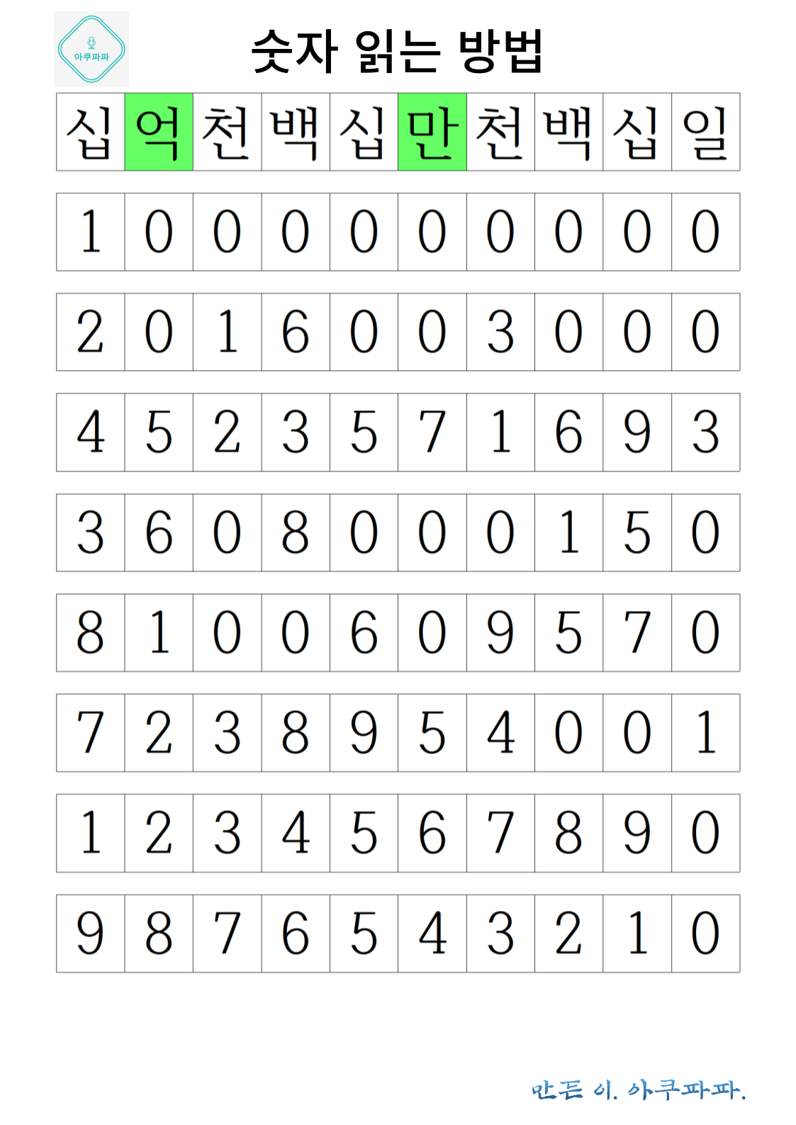 위 표가 익숙해진다면 아무 숫자라도 적어서 읽는 연습을 계속해보면 금방 익숙해 질 거에요.
