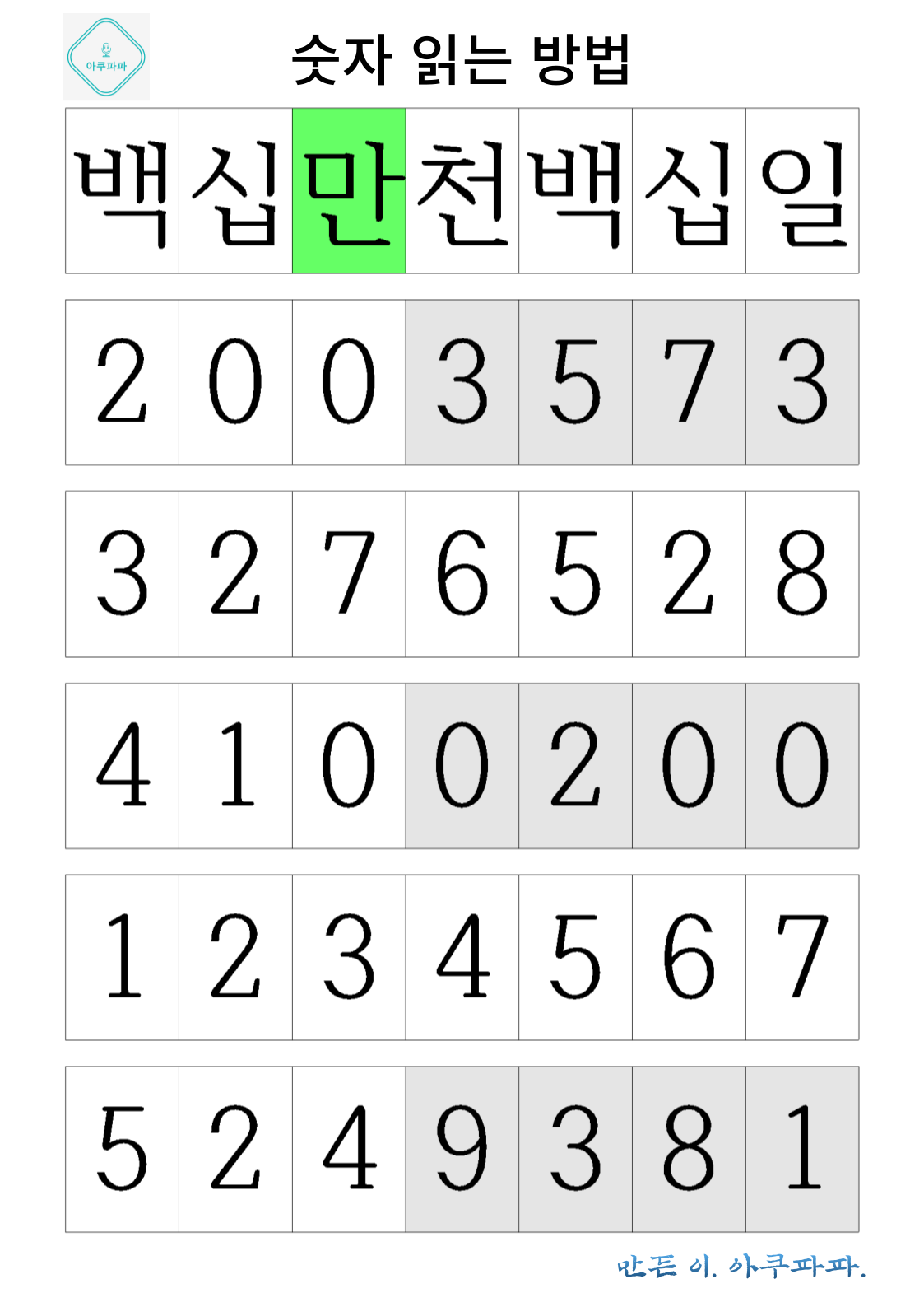 맨위 칸에 해당하는 숫자 단위가 한글로 쓰여져 있습니다.